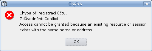 Nejčastější chyba při registraci bývá konflikt uživatelských jmen. O této situaci vás bude eventuelně informovat následující zpráva: